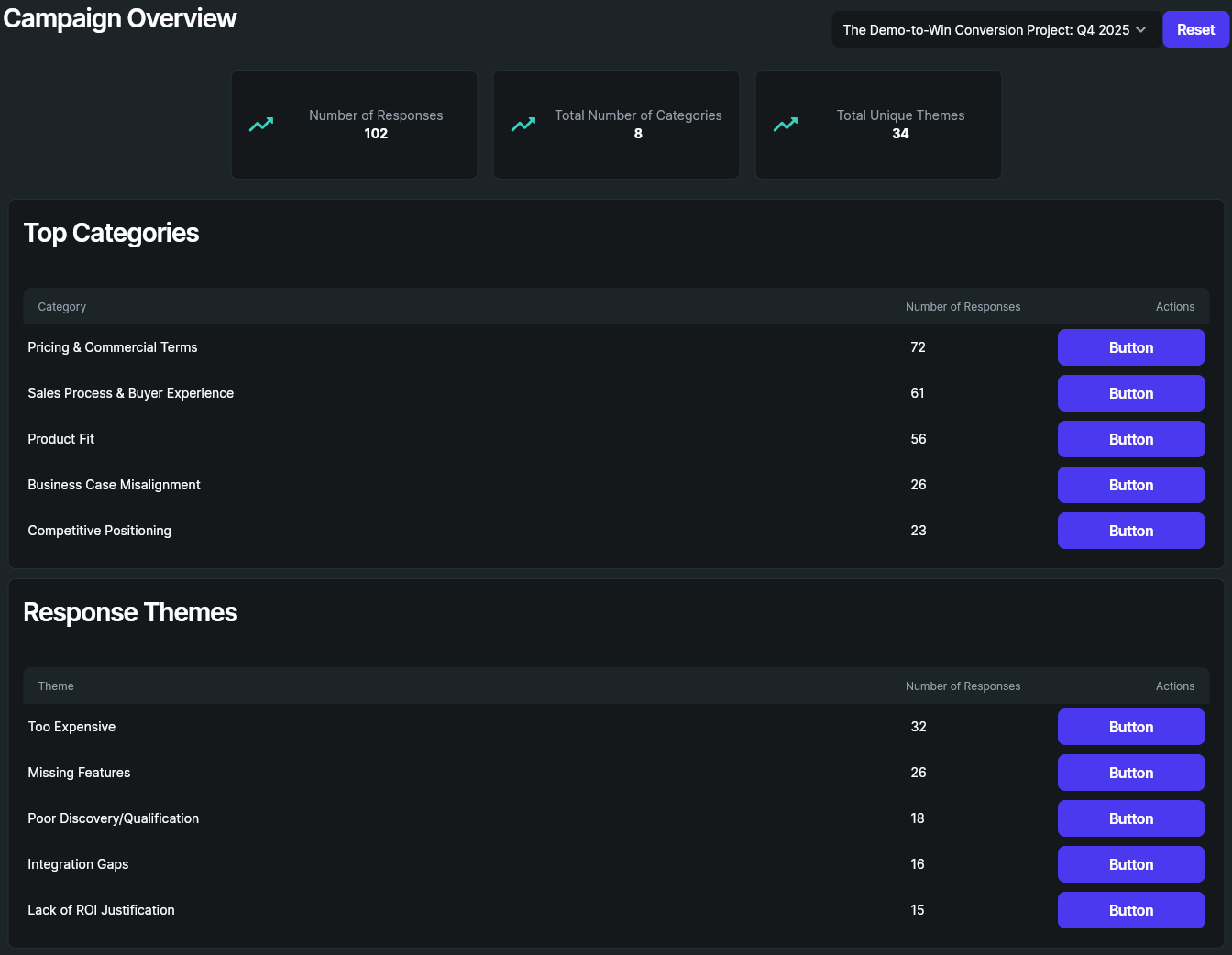 Our AI analizes and categorizes every response to uncover and highlight the reasons deals are not being won.